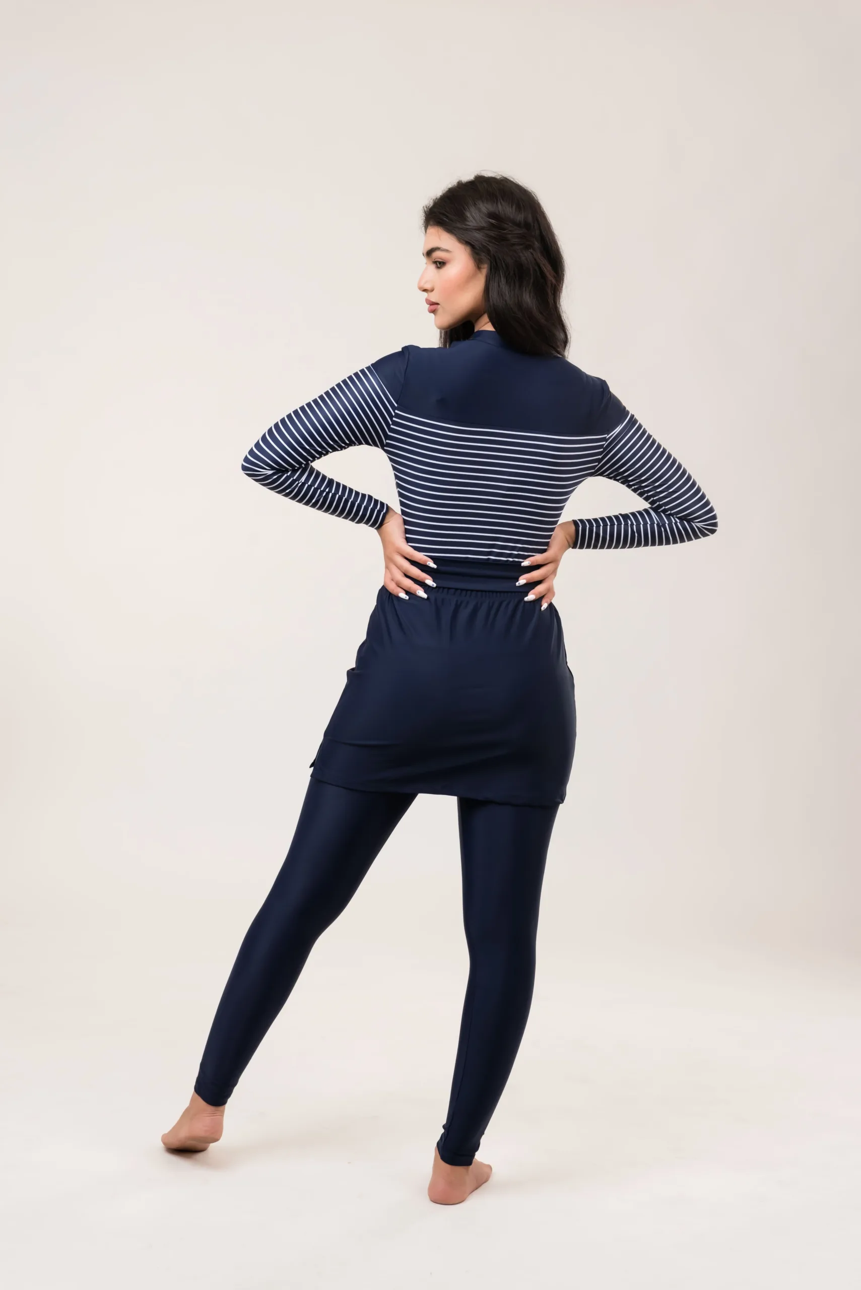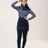يتميز البوركيني مع التنورة من MelianaK بتصميمه المتطور: بيكيني علوي مخطط بنقشة بحار، مصحوبًا بطماق لتشكيل الجسم وتنورة سباحة بوركيني مستقيمة. توفر هذه المجموعة صورة ظلية أنيقة مع ضمان تغطية متواضعة.