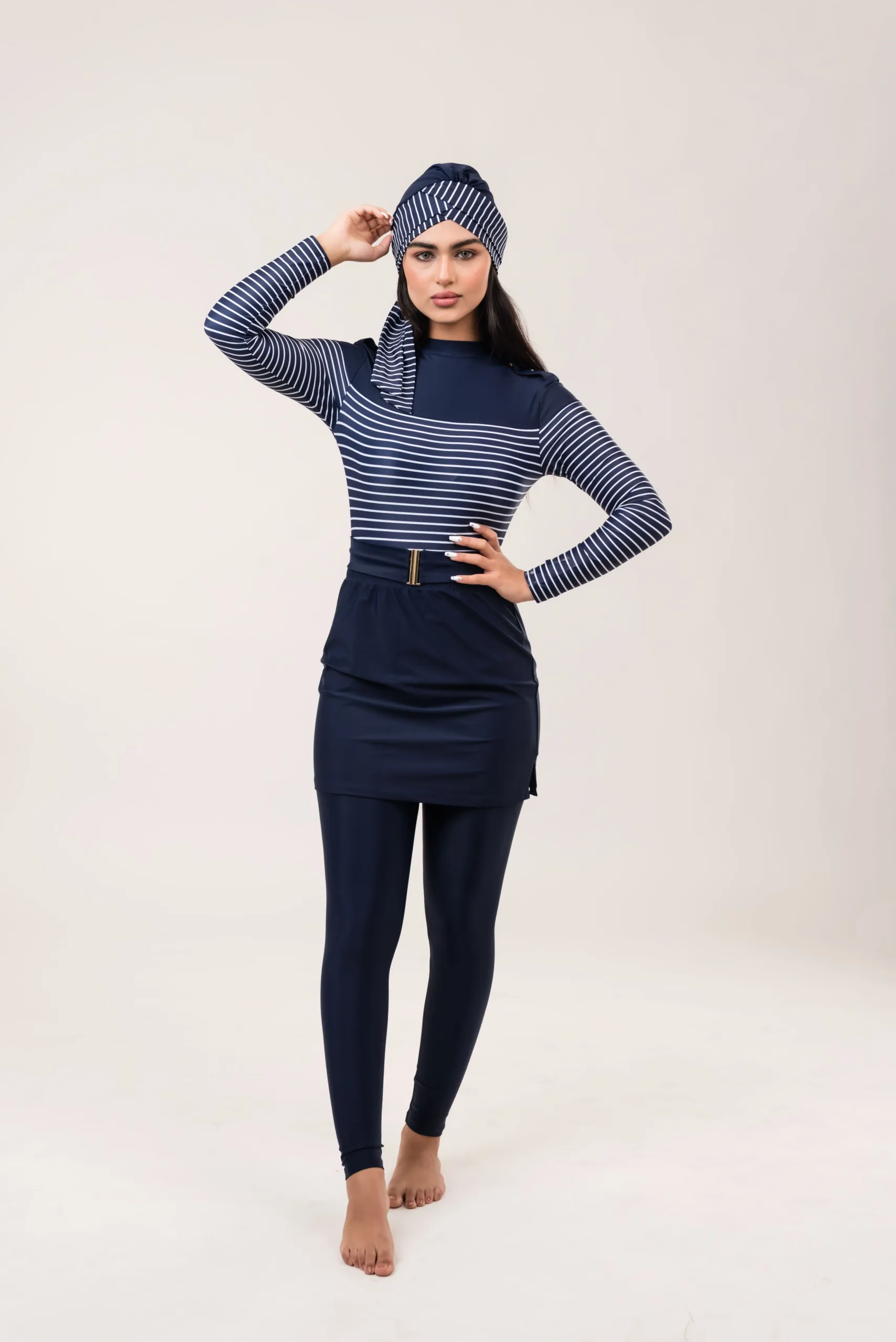 بوركيني مع تنورة مخططة من 3 قطع، وبنطال ضيق وإكسسوارات.