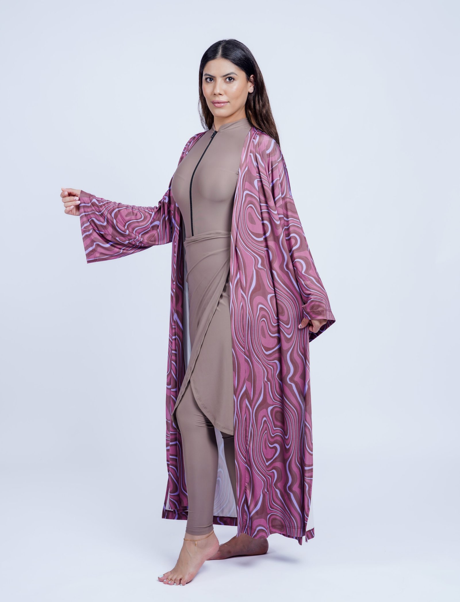 Ce kimono long et fluide est orné de motifs élégants en roses et marrons, offrant une touche de sophistication à toute tenue de plage ou de détente.